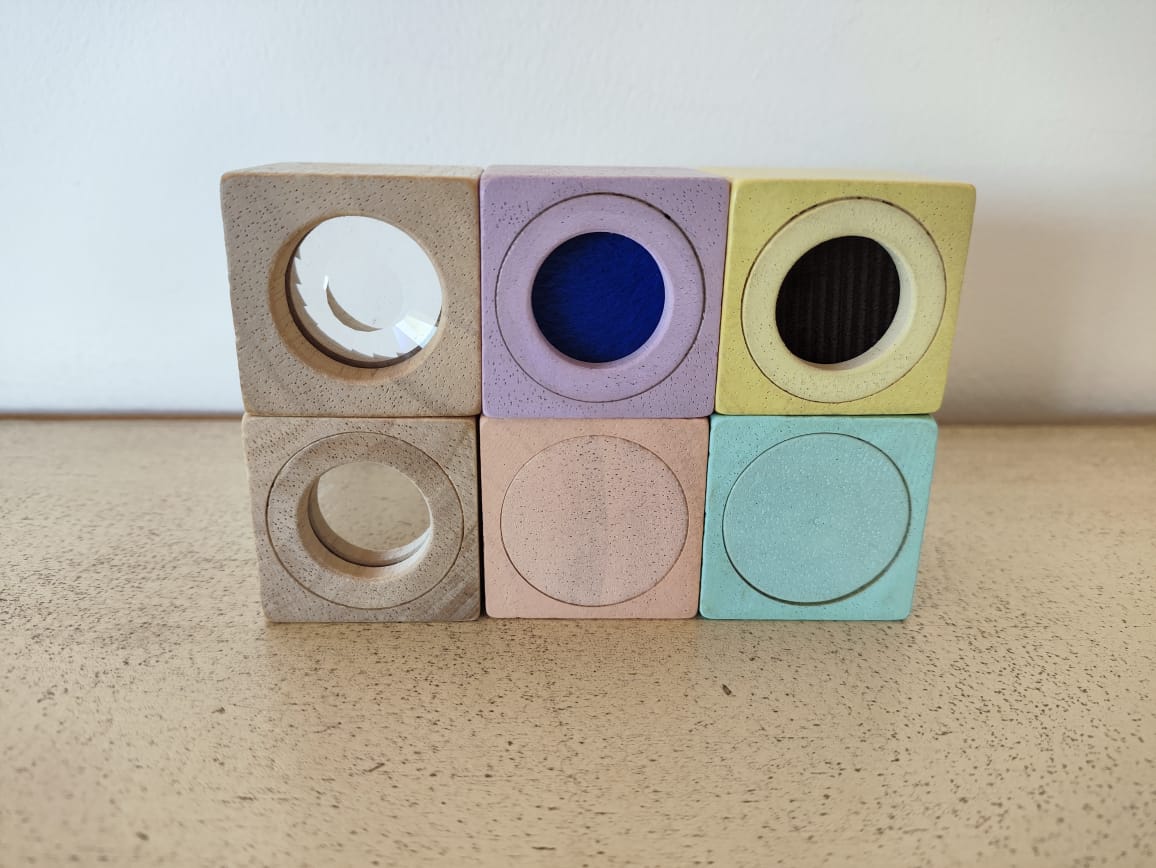 6 bloques sensoriales: 2 estimulan lo visual, 2 lo táctil y 2 lo sonoro.
