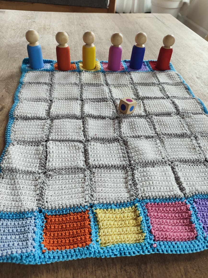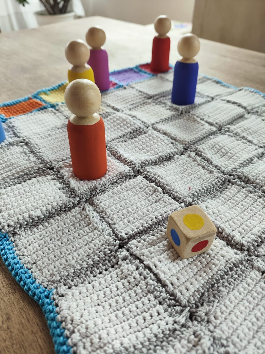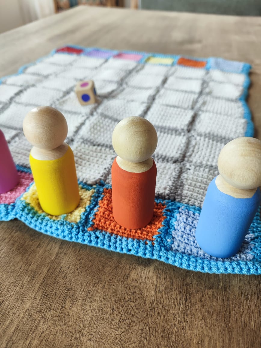 El juego de los colores es ideal para un primer juego de mesa. Incluye un tablero tejido, 6 muñecos de madera de diferentes colores y un dado con colores. El juego consiste en tirar el dado por turnos y el color que sale tiene que avanzar un casillero. Los jugadores irán avanzando hasta llegar al otro lado del tablero.