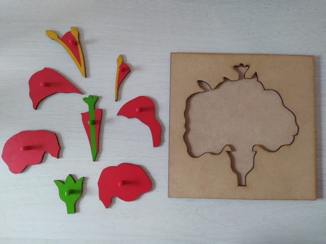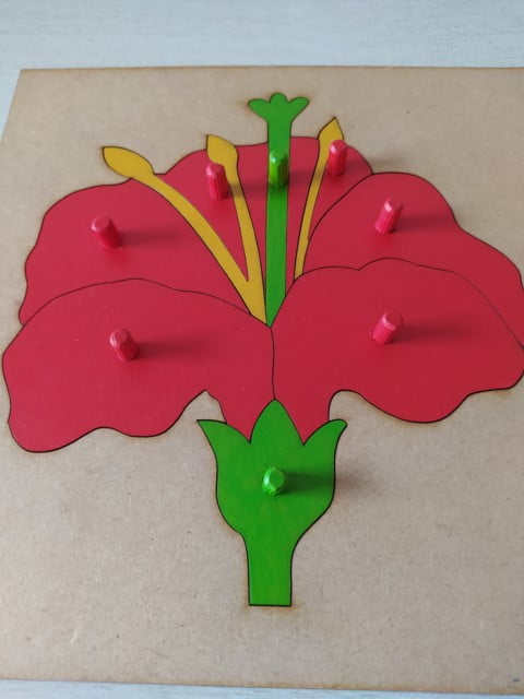 El puzzle flor pertenece al área de botánica en un ambiente Montessori. Invita al niño a conocer las partes que componen la misma e investigar sobre los distintos tipos y funciones. Con perillas para un fácil agarre de las piezas, utilizando el movimiento de pinza con sus dedos.